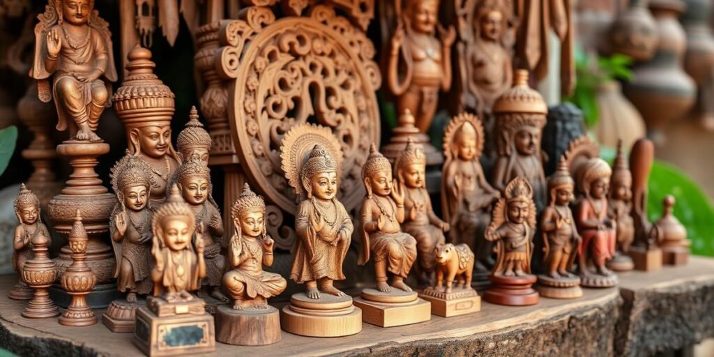 Traditional Indian handicrafts made from wood showcase cultural heritage and artistic skills.